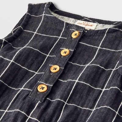 Dress up your newborn in cool comfort with this Checkered Gauze Tank Henley Romper from Cat & Jack™. This sleeveless gauze romper features a three-button placket henley neck and a cream checkered pattern against a dark gray background for a fun touch of classic style. The 100% cotton fabric along with elastic at the leg openings makes this tank romper cool and comfortable to wear, while the crotch snaps allow for easy diaper changing.