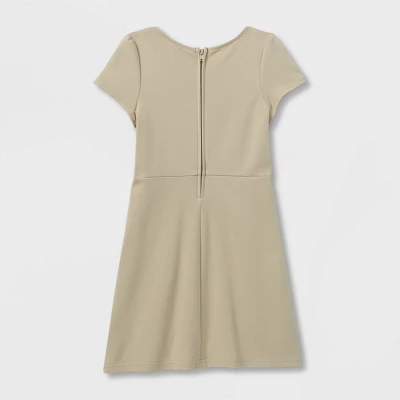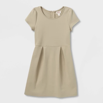 Add smart style to their everyday essentials with this Short-Sleeve Uniform Knit Jumper from Cat & Jack™. This knee-length dress is made of a lightweight cotton-blend fabric with a hint of spandex for breathable, stretchy wear, and it’s designed in a solid color for easy mixing and matching. The round-neck dress gently flares at the waist with a pleated design and sports a back half-length zipper for easier dressing.