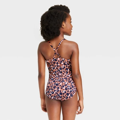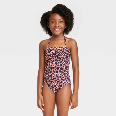 Your child will love adding this Cheetah in Hiding One-Piece Swimsuit from Cat & Jack™ to their swimwear collection. Made from a soft, stretchy fabric and full lining for comfy movement in and out of the water, this waffle-textured swimwear is adorned with an allover cheetah-spot print in navy and white on a peach background for a fun look. A fabric overlay across the chest with a knotted bow and thin shoulder straps that crisscross at the back give the sleeveless swimsuit a sweet look, while its UPF 50+ rating helps keep your kid shielded from the sun’s UV rays while they have fun in the sun.