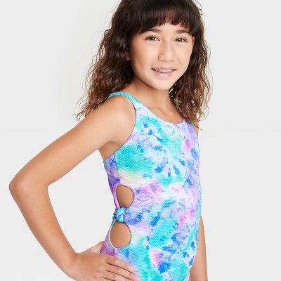 Dress up your kid in eye-catching style for the beach or pool in the Sweetie Tie-Dye One-Piece Swimsuit from Cat & Jack™. This tie-dye swimsuit is made with a mix of soft and stretchy fabric with elastic at the leg openings to help them dive in or play in the sand in comfort. The full-coverage swimsuit features a sleeveless design with cut-out detailing along the sides to sweeten up the look, and comes with UPF 50+ rated fabric to help keep their skin shielded from the sun’s rays.