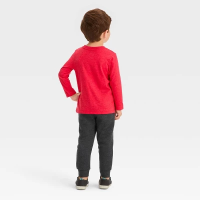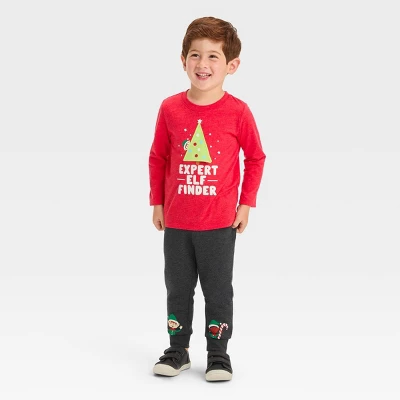 Dress up your toddler in festive style while helping keep them cozy with the 2-Piece Long-Sleeve Graphic T-Shirt and Fleece Jogger Set from Cat & Jack™. This outfit set includes a long-sleeve pullover featuring an elf hiding behind a Christmas tree with the message “Expert Elf Finder,” while the jogger pants showcase elves holding candy canes for a fun, festive look. Plus, the banded cuffs offer a snug fit. The set is crafted from cotton-blend fabric to offer comfort, and you can easily pair the pieces with other clothing in their wardrobe to change their look.