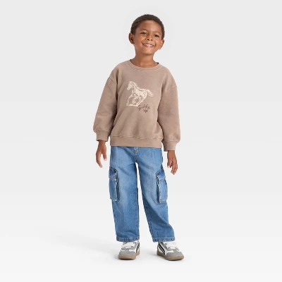 Your little one will be galloping all day in comfort and cute style in this Western Horse Sweatshirt from Cat & Jack™. Made from cotton-recycled polyester blend, 1×1 rib fabric, this crewneck sweatshirt offers all-day cozy comfort. Tailored in a regular-fit silhouette, it’s designed with ribbed detailing on the cuffs and hem for a snug fit and neat finish. Showcasing a white-hued horse graphic along with the caption “Giddy Up” on the front, you can help them pair it with different jeans, shorts or skirts for versatile outfit options.