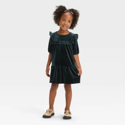 Dress up your little one for parties or occasions with this Solid Short-Sleeve A-Line Dress from Cat & Jack™. This black short-sleeve dress fashioned in an A-line silhouette features dressy frill details on the front and back yoke, a tiered hem and side seam pockets for functional flair. The soft velour fabric with added stretch offers them a cozy and comfortable fit, while the back keyhole button makes dressing them a breeze. Have them wear it with sandals or metallic shoes to complete the look.