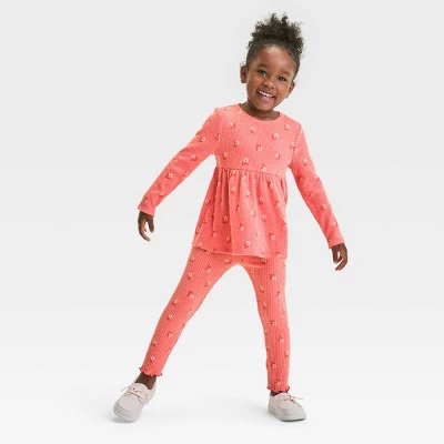Add a touch of coziness and style to their wardrobe with this Floral Shirt from Cat & Jack™. This ribbed long-sleeve top features a sweet floral pattern on a fresh orange backdrop, a casual crewneck and peplum style. The soft and stretchy material provides flexible comfort, while the pullover design allows for easy dressing. Pair with a variety of bottoms to create comfy versatile outfits.