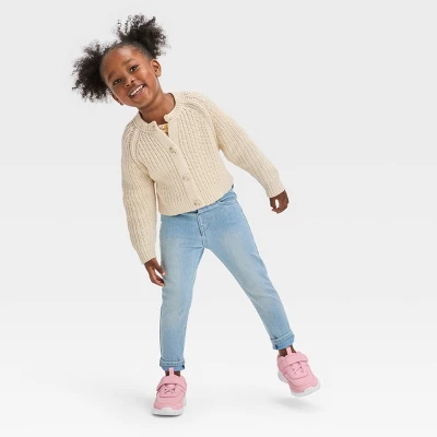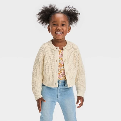 This Midweight Cardigan from Cat & Jack™in a neutral off-white color makes a versatile layering staple in your little one’s cool weather closet. Fashioned in a relaxed silhouette with a below-waist length, it features a midweight knitted construction for a warm and cozy feel. The front button closures along with a crewneck allow for easy dressing, while the ribbed hem and cuffs offer them a snugger fit. Help them wear this cardigan over their tops and dresses for extra coverage on cooler days.