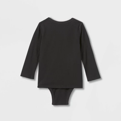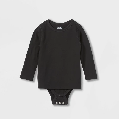 Keep your darling comfortably covered with this Black Long Sleeve Bodysuit from Cat & Jack™. This long-sleeve bodysuit makes a practical addition in their everyday wardrobe. Made from a cotton-blend fabric, its tagless design and flat seams provide a soft and comfortable feel. Plus, this crewneck bodysuit comes with crotch snap closures for quick changing and dressing. Mix and match this solid black bodysuit with nearly any bottoms in their wardrobe.